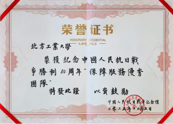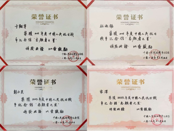 近日,中国人民抗日战争纪念馆举行表彰大会,理学院于翔宇、杜雨锡、宋泽、彭仁昊4名学生荣获2025年度中国人民抗日战争纪念馆“志愿者之星”。北方工业大学荣获纪念中国人民抗日战争胜利80周年“保障服务优秀团队”。