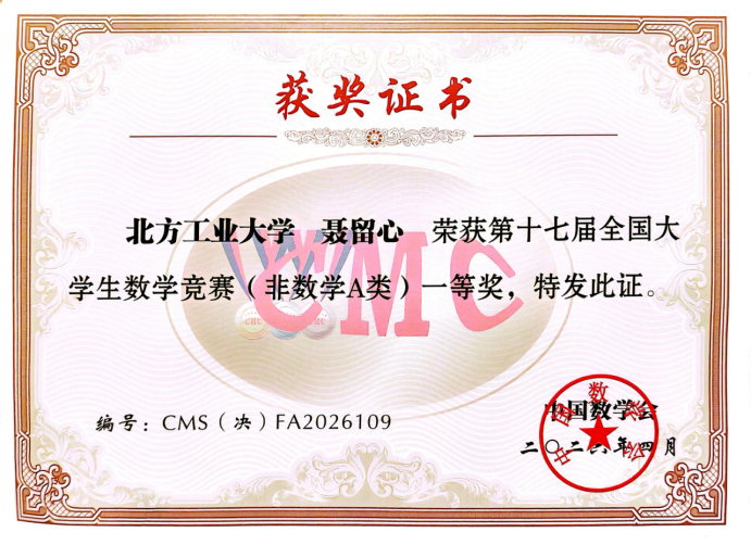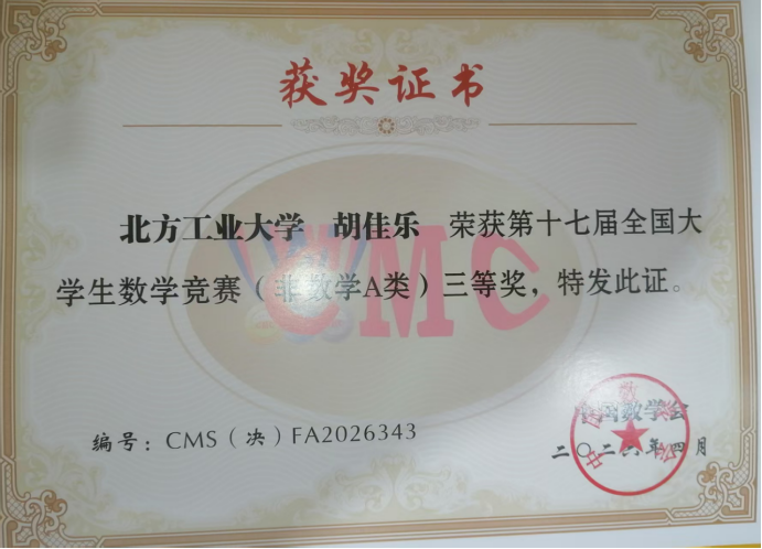 该竞赛是由中国数学会主办,是面向全国本科生的最高等级的数学学科竞赛,也是全国最有影响力的学科竞赛之一。全国共有32个赛区35.2万名学生参加了初赛。北京市数学会根据初赛成绩选取了来自北京大学、清华大学、北京航空航天大学等高校的50名选手组成了北京赛区非数学专业A组(即理工组)代表队参赛。我校人工智能与计算机学院计算机专业24-3班胡佳乐与布鲁内尔学院大数据专业24-2班聂留心同学入选。这也是北京赛区非数学类代表队中仅有的两名来自市属高校的学生。在决赛中,两名同学充分发挥了不畏困难、顽强作战、寸土必争的北方工大精神,取得了优异的成绩,聂留心同学荣获全国非数学专业A组一等奖,胡佳乐同学荣获三等奖。